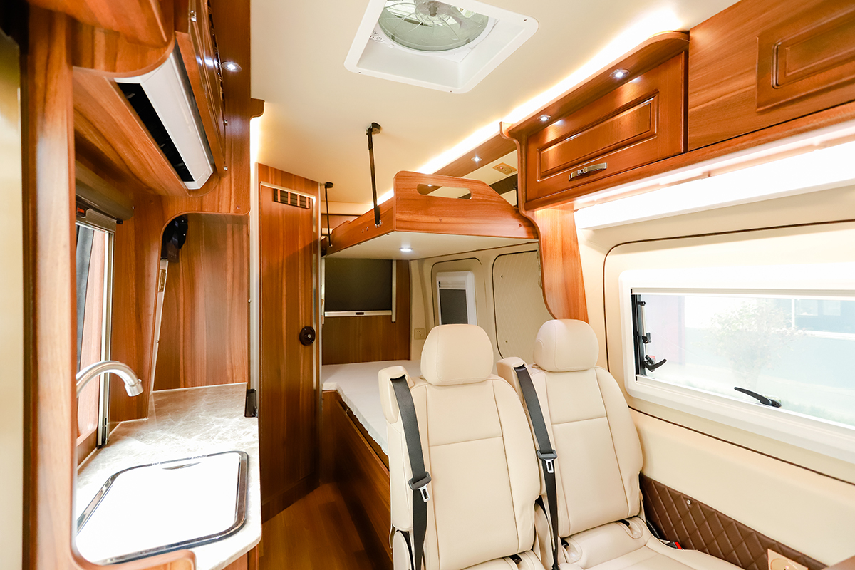 整车内饰及车顶为软包、驾驶区及车门处采用隔热棉及止震板设计,起到隔音及保温的效果;车内米黄/白色座椅包覆处理,板材分为红色及浅色两种;部分实木家具+游艇地板革设计更加贴合居家氛围感。主驾驶座后排则是由单排双人豪华座椅+古典茶台桌组成,座椅靠背可翻到放平,形成一个置物平台便于存放物品,整体座椅也可向前微调距离,迎合不同身高用户群体。前方因而叫茶台桌,是将餐桌做了双侧结构,将茶台隐藏其中。侧面墙壁拥有外推窗,保持采光和通风效果。