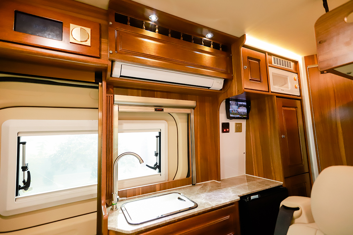 为保证夏天可以悠然自得的户外露营,为此中门带有纱门纱窗设计,细节贴心。长条形的多功能料理台台面设计了不锈钢水槽+水龙头,上方盖板还可当切菜案板使用。墙壁设计有充电插座,方便电磁炉或其它电器的日常辅助使用。顶部吊柜及料理台下方储物柜方便收纳碗具及物资。电器集成控制面板位于乘客门上方,采用触摸式设计,易于操作。其余配置包括微波炉、日本富士通家用空调、12V 85L车载冰箱、四路监控、一个5kg煤气罐、德国进口伟巴斯特燃油加热系统、韩国东一过热水系统及车载水泵。